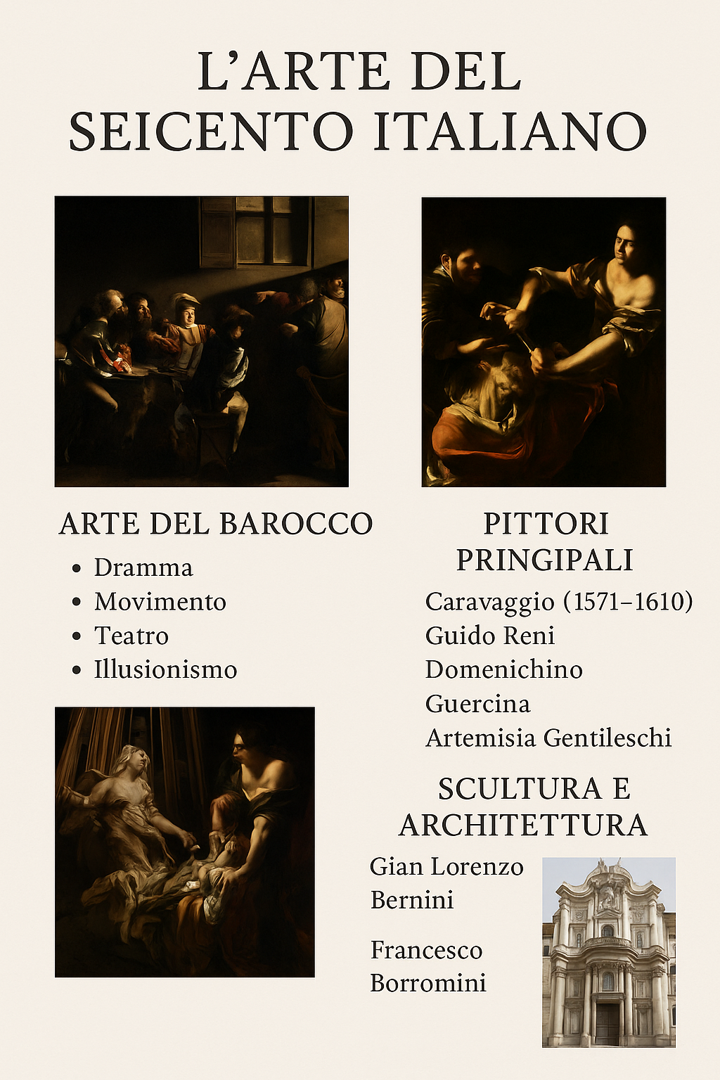 Trattato sull’Arte del Seicento Italiano Premessa Storica e Culturale Il Seicento italiano, noto anche come il secolo del Barocco, è un periodo d’intensa fioritura artistica e culturale che si estende all’incirca dal 1600 al 1700. È un’epoca dominata da profonde trasformazioni religiose, politiche e sociali, strettamente connesse alla Controriforma cattolica, che ha determinato le scelte estetiche e ideologiche dell’arte del tempo. Il Concilio di Trento (1545-1563), con le sue direttive, impone all’arte un compito catechistico e devozionale, stimolando una produzione artistica capace di emozionare, coinvolgere e persuadere i fedeli. Estetica Barocca: Dramma, Movimento, Teatro L’arte barocca italiana si distingue per la spettacolarità, il dinamismo e la teatralità. L’obiettivo dell’artista non è più solo rappresentare la realtà, ma superarla, sublimarla, elevarla a visione. Le composizioni si fanno complesse, le linee curve dominano lo spazio, la luce acquista un valore narrativo e simbolico. Uno dei capisaldi della poetica barocca è l’illusionismo: affreschi che si aprono verso l’infinito, architetture che sfidano la gravità, prospettive forzate che amplificano lo spazio reale. La chiesa non è più solo un luogo di culto, ma diventa un teatro del sacro. Pittori Principali Scultura e Architettura Critica d’Arte sull’Arte del Seicento Italiano Luce e Ombra: un’Arte delle Contraddizioni L’arte del Seicento italiano è al tempo stesso glorificazione e tensione. Esalta la religione, ma spesso mette in scena la fragilità e la corruzione dell’umano. Si mostra grandiosa, ma non priva di una dimensione drammatica, quasi ossessiva. L’approccio caravaggesco, ad esempio, è stato oggetto di forti critiche da parte dei contemporanei per il suo “realismo volgare”. Oggi, al contrario, viene esaltato per la sua capacità di rompere con le convenzioni accademiche e di restituire all’arte una carica emotiva sincera e potente. D’altro canto, l’arte barocca è stata spesso tacciata di eccesso: troppo ornata, troppo teatrale, troppo enfatica. Questa visione, dominante nel Settecento e Ottocento, ha in parte oscurato la sua profondità intellettuale e la sofisticazione tecnica. Solo con la rivalutazione novecentesca si è compreso il valore concettuale dell’arte barocca come strumento di comunicazione visiva complessa, che unisce emozione, teologia e politica. La Femminilità nell’Arte del Seicento La presenza di Artemisia Gentileschi rompe un canone dominato da uomini e propone una visione diversa, più interiore e critica. Le sue Giuditte non sono solo eroine bibliche, ma figure di rivalsa personale e sociale, veicolando un messaggio femminista ante litteram. Un’opera emblematica del Seicento italiano è “L’Estasi di Santa Teresa” di Gian Lorenzo Bernini, realizzata tra il 1647 e il 1652 per la Cappella Cornaro nella chiesa di Santa Maria della Vittoria a Roma. Perché è un’opera simbolo del Seicento italiano 1. Sintesi perfetta del Barocco Quest’opera rappresenta in modo straordinario tutti gli elementi chiave del Barocco: 2. Contenuto spirituale e sensuale L’opera è tratta dai racconti mistici di Santa Teresa d’Avila, ma Bernini ne enfatizza la componente corporea e quasi erotica, incarnando alla perfezione il legame barocco tra sacro e sensuale. 3. Un capolavoro totale Non è solo scultura: è architettura, luce, spazio, emozione. Bernini fonde tutte le arti in un’opera unica, anticipando il concetto moderno di “installazione”. Conclusione Critica Il Seicento italiano è un secolo di sfide e soluzioni estetiche innovative. L’arte diventa strumento di potere, di fede, ma anche di riflessione sull’uomo e sul divino. È un’arte che non vuole essere solo ammirata: vuole scuotere, commuovere, convertire. Per questo il Barocco non può essere semplicemente amato o odiato: va capito nella sua essenza contraddittoria, ambiziosa, e profondamente umana.