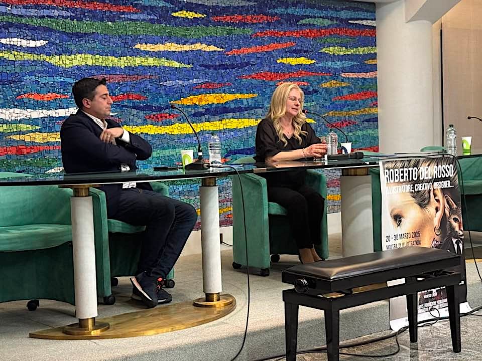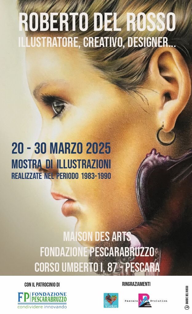 Si è conclusa l’inaugurazione della mostra dedicata a Roberto Del Rosso ospite della FondazionePescaraAbruzzo con intro musicale, davvero suggestiva, del Maestro Alessandro Cavallucci con brani alla chitarra dedicati a Roberto.Il tutto presentata dalla moglie Emira De Acetis, dal Critico Prof. Andrea Viozzi e con il coinvolgimento dI Giancarlo Costanzo Presidente dell’Associazione P.A.E. e Tiziano Tiberi compagno di scuola di Roberto. Presentazione Critica del Prof. Andrea ViozziPer aprire lo scrigno di un pittore, di una pittrice, di un’artista, di un illustratore, di un designer. È un pezzo di cuore che viene presentato al pubblico, è un cassetto che si apre e che viene messo a disposizione di chi ne usufruisce, di chi ne gode, di chi lo osserva. Questa splendida esposizione è stata pensata dalla famiglia per onorare la memoria di un grande padre, marito, professionista, illustratore, designer, ed è appunto la prima di una serie di tappe che la famiglia ha in mente per onorare la memoria del grande creativo che è stato Roberto del Rosso. Avrete modo fra poco di poter scendere dove è stata allestita la mostra e godere delle oltre 40 opere. Qualche settimana fa, parlando con la signora Emira, mi diceva: “Saranno una trentina”, ma io sapevo che non si sarebbe fermata a 30. Perché? Perché quando poi apri il cassetto dei ricordi, è normale che ogni frammento, ogni pezzettino, che sia un’illustrazione, che sia una diapositiva, che sia una fotografia, ti rimanda indietro nel tempo. E immagino la fatica che abbiano fatto lei e i suoi figli nel selezionare le opere, pensando se davvero quelle erano le opere che Roberto avrebbe voluto vedere oggi in mostra. Sicuramente sì. Roberto del Rosso è stato un uomo che fin da bambino ha avuto l’estro della creatività. Emira De Acetis moglie di Roberto ed Il Maestro Alessandro Cavallucci Fin da quando, appunto, maneggiava con il pongo piccolino accanto al capezzale del padre malato, e realizzava i suoi soldatini con il pongo, per poi intraprendere gli studi presso il celebre liceo artistico di Pescara. Fra l’altro c’è qui uno dei suoi insegnanti in sala, il professor Gammelli. Ci sono tanti suoi ex studenti, i suoi ex compagni di scuola oltre che amici, per poi iniziare due percorsi paralleli: uno nell’Istituto europeo di design di Roma e l’altro presso la facoltà di architettura di Pescara dell’Università di Chieti-Pescara, per poi, nel 2002, intraprendere una splendida iniziativa professionale insieme alla moglie. Questo l’ha portato a una scelta se iniziare un percorso professionale, ma ciò chiaramente per motivi di tempo, per motivi lavorativi, non gli ha permesso di concludere il ciclo universitario. Ma fin da giovane, fino all’età di 19 anni, i disegni che vedrete poi sotto, le illustrazioni che vedete sotto, raccolgono 7 anni delle attività di Roberto, dal 1983 al 1990, ed è un frammento della sua attività che ci mostra la sua grande capacità di utilizzare, tra l’altro, diverse tecniche artistiche dai pastelli.Che permette a Roberto e a chiunque li sa maneggiare come lui di poter, in un certo qual senso, far vibrare il colore, proprio come facevano i grandi maestri dell’impressionismo, per esempio, la matita, il carboncino, gli acquerelli che, come voi ben sapete, è la tecnica tra le più difficili, se non la più difficile in assoluto, nel campo artistico. Perché l’acquerello non ti lascia tempo, devi lavorare velocemente perché altrimenti si asciuga e non puoi più tornare sull’opera. Tra l’altro, le tecniche dell’acquerello non sono una, ma ben 12 tecniche artistiche dell’acquerello che Roberto sapeva ben maneggiare, tecnica tra l’altro antichissima, l’acquerello di origine orientale, proprio come l’inchiostro a china che lui stesso utilizzava, fino ad arrivare agli strumenti un po’ più moderni come l’aerografo, utilizzato anche da grandi maestri come Murray e Salvatore Dalì, il pantone che gli permetteva di dare un effetto particolare del colore sulla grafica e poi la cartografia, soprattutto durante gli studi a Roma, nell’Istituto europeo del design. Quindi un grande creativo che ha sperimentato diverse tecniche e che ha avuto la possibilità di collaborare con grandi marchi realizzando per loro tantissime opere.Dalla famiglia De Cecco, celebre famiglia abruzzese, alla Casucci Jeans, all’Energy Aprioni, celebre marca di abbigliamento di tradizione siromana, ma di origine abruzzese. Quindi è stato un uomo, un illustratore che si è messo a disposizione dei più grandi marchi del tempo partecipando, tra l’altro, a grandi fiere per i quali progettava e realizzava i loro stand a Firenze, a Palazzo Pitti, la casa della moda, oltre che della celebre collezione Palatina, a Firenze, a Parigi e nelle più grandi capitali europee, in Russia, nei più grandi centri del design russo e negli Stati Uniti. Quindi un uomo che è riuscito, in un certo qual senso, a dar prova della sua grande abilità e del suo grande estro creativo mettendosi a disposizione degli altri. La differenza fra un artista e un designer sta nel fatto che il designer, quando crea, lo fa principalmente per i suoi utenti. È vero che anche oggi i pittori spesso realizzano le loro opere per poterle vendere, ma soprattutto il designer, l’illustratore, quando crea sa già ha nella sua mente il fine di soddisfare pienamente il suo cliente. E Roberto ci è riuscito in maniera straordinaria. La nostra presenza questa sera e la notorietà di Roberto nel campo dell’illustrazione e del design lo dimostrano.Vedevo prima meravigliosamente arpeggiare il maestro Cavallucci con quelle sue mani sulla chitarra, e allora pensavo seduto lì a Roberto che con la sua matita, col suo carboncino, quando ancora non c’erano i programmi che ci sono oggi di lavorazione del design, riusciva a creare dei capi straordinari e li vedrete in mostra. Dei meravigliosi capi che lui vede, osserva da fotografie delle grandi case di m